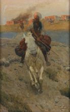 Вот такой всадник прискакал к нам из Нидерландов и присоединился к многочисленной толпе кавказцев, казаков, мародёров, грабителей и знаменосцев, созданных талантом Франца Алексеевича Рубо за многие годы творчества. Картина была выставлена на продажу 11 декабря 2020 года на голландском аукционе Veilinghuis De Ruiter из города Клаасвааль (Klaaswaal). Холст, масло, 62х40 см, подписная, в раме. Организаторы аукциона установили эстимейт в 1000 евро и надеялись выручить за нее 1500-2500 евро. Но работа была продана за 14000 евро.