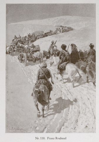 Эту картину дважды, в 1922 и 1924 гг., выставлял на продажу аукционный дом Рудольфа Бангеля (Rudolf Bangel), располагавшегося во Франкфурте на Майне. По заведённой в те годы традиции, в каталогах аукционов было дано словесное описание картины: «Караван, состоящий из множества тяжёлых двухколёсных телег, запряжённых лошадьми, движется по серпантину по заснеженному холмистому ландшафту, а вооружённые черкесы охраняют их». Была ли продана эта работа и где она сейчас находится – неизвестно. В каталог произведений Ф. Рубо, составленный О. Сугробовой-Рот и Э. Лингенаубером в 2012 году, картина не вошла.