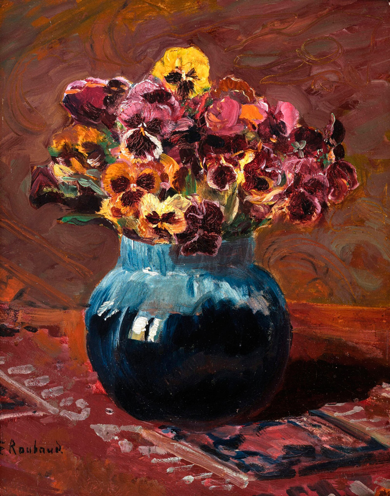 Pansies in a blue vase