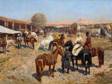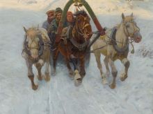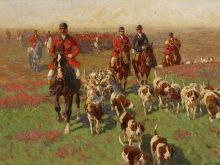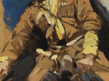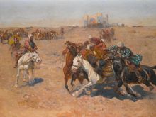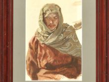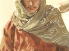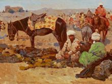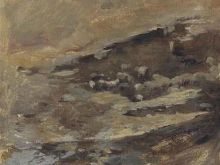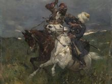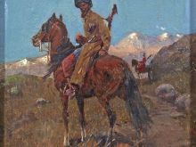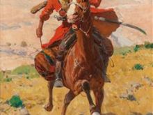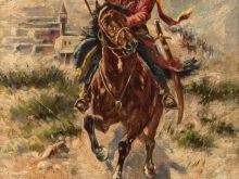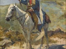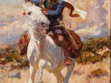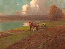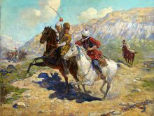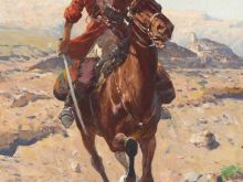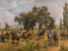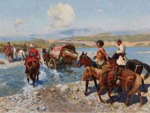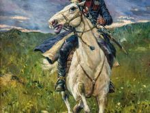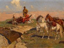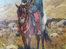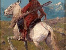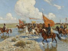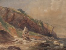Flusstal mit Burgruine, im Vordergrund ein Schäfer