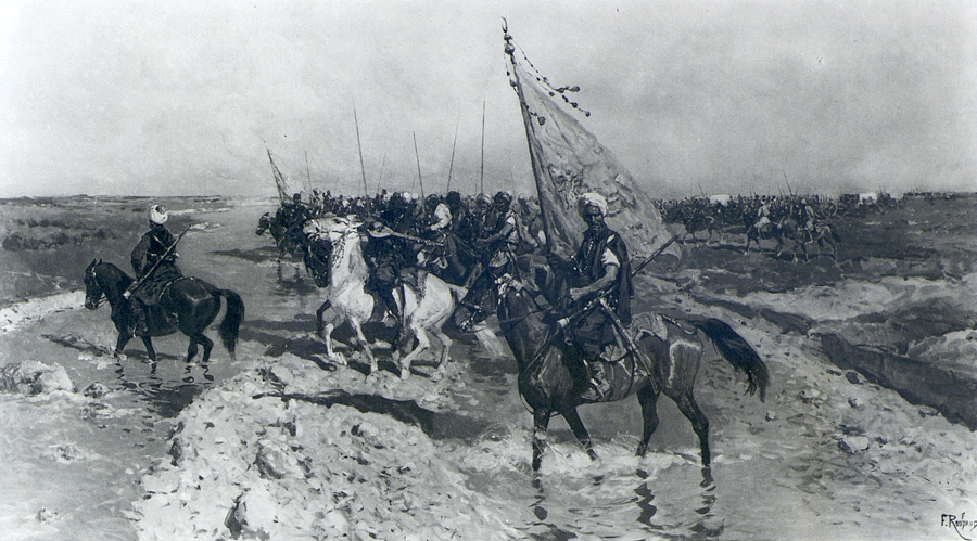 Черкесские войска форсируют реку с музыкантом на сером коне