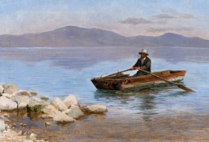 Mann im Ruderboot an einem See