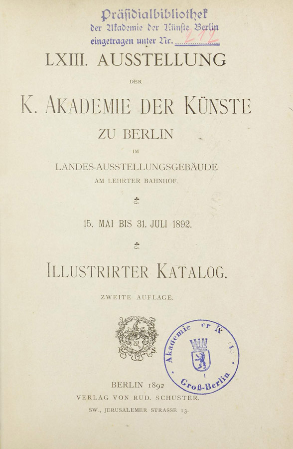 Katalog der LXXI Ausstellung der Akademie der Künste zu Berlin. Berlin, 1892