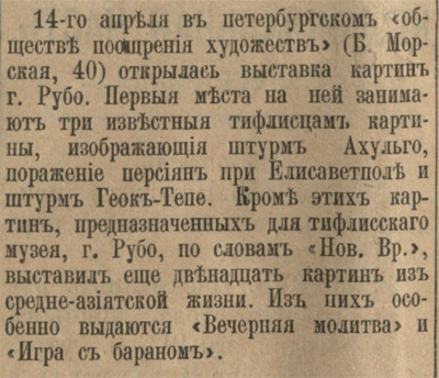 14-го апреля в петербургском «обществе поощрения художеств» (Б. Морская, 40) открылась выставка картин г. Рубо. Первые места на ней занимают три известные тифлисцам картины, изображающие штурм Ахульго, поражение персиян при Елисаветполе и штурм Геок-Тепе. Кроме этих картин, предназначенных для тифлисского музея, г. Рубо, по словам «Нов. Вр.», выставил еще двенадцать картин из средне-азиатской жизни. Из них особенно выдаются «Вечерняя молитва» и «Игра с бараном».