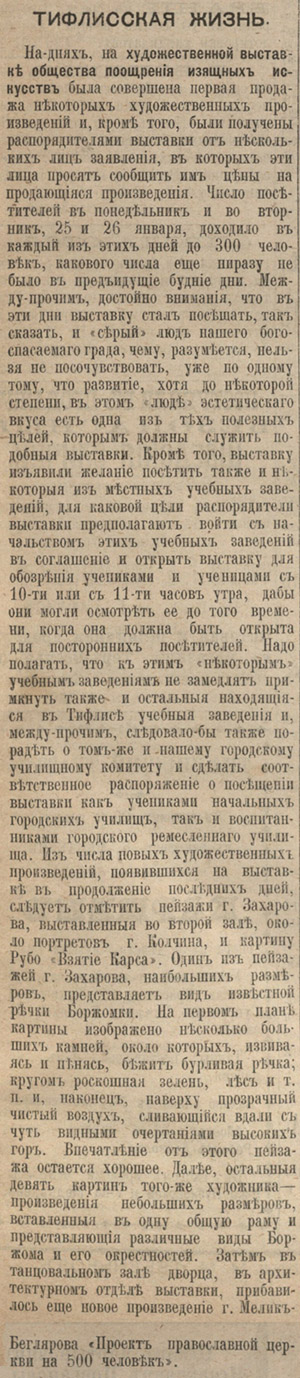 На днях, на художественной выставке общества поощрения изящных искусств была совершена первая продажа некоторых художественных произведений и, кроме того, были получены распорядителями выставки от нескольких лиц заявления, в которых эти лица просят сообщить им цены на продающиеся произведения. Число посетителей в понедельник и во вторник, 25 и 26 января, доходило в каждый из этих дней до 300 человек, какового числа еще ни разу не было в предыдущие будние дни. Между прочим, достойно внимания, что в эти дни выставку стал посещать, так сказать, и «серый» люд нашего богоспасаемого града, чему, разумеется, нельзя не посочувствовать, уже по одному тому, что развитие, хотя до некоторой степени, в этом «люде» эстетического вкуса есть одна из тех полезных целей, которым должны служить подобные выставки. Кроме того, выставку изъявили желание посетить также и некоторые из местных учебных заведений, для каковой цели распорядители выставки предполагают войти с начальством этих учебных заведений в соглашение и открыть выставку для обозрения учениками и ученицами с 10-ти или с 11-ти часов утра, дабы они могли осмотреть ее до того времени, когда она должна быть открыта для посторонних посетителей. Надо полагать, что к этим «некоторым» учебным заведениям не замедлят примкнуть также и остальные находящиеся в Тифлисе учебные заведения и, между прочим, следовало бы также порадеть о том же и нашему городскому училищному комитету и сделать соответственное распоряжение о посещении выставки как учениками начальных городских училищ, так и воспитанниками городского ремесленного училища. Из числа новых художественных произведений, появившихся на выставке в продолжение последних дней, следует отметить пейзажи г. Захарова, выставленные во второй зале, около портретов г. Колчина, и картину Рубо «Взятие Карса». Один из пейзажей г. Захарова, небольших размеров, представляет вид известной речки Боржомки. На первом плане картины изображено несколько больших камней, около которых, извиваясь и пенясь, бежит бурливая речка; кругом роскошная зелень, лес и т.п. и, наконец, наверху прозрачный чистый воздух, сливающийся вдали с чуть видными очертаниями высоких гор. Впечатление от этого пейзажа остается хорошее. Далее, остальные девять картин того же художника — произведения небольших размеров, вставленные в одну общую раму и представляющие различные виды Боржома и его окрестностей. Затем в танцевальном зале дворца, в архитектурном отделе выставки, прибавилось еще новое произведение г. Мелик-Беглярова «Проект православной церкви на 500 человек».