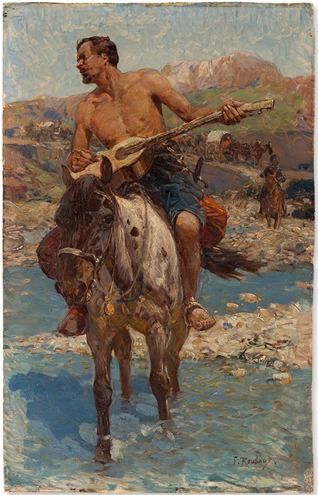 Caucasian horseman with a guitar fording a river, followed by horse-drawn carriages
