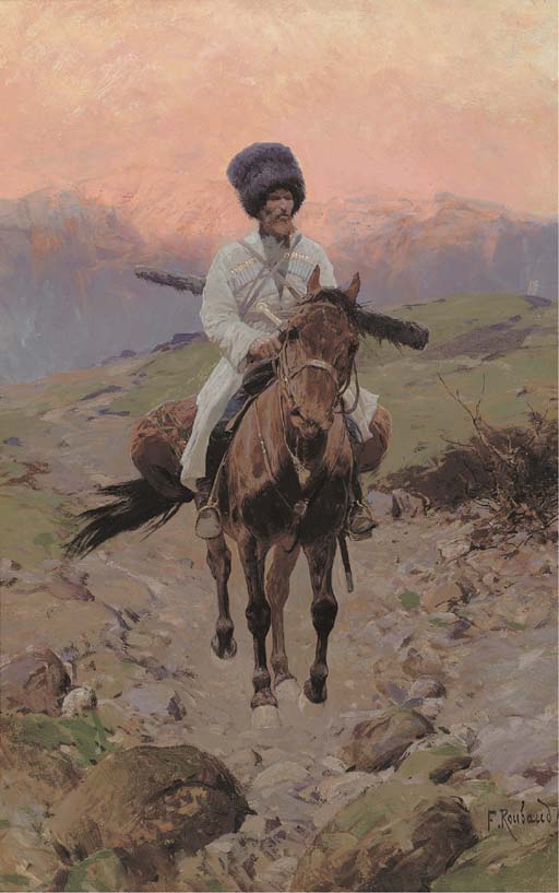 A Cossack on horseback at sunset