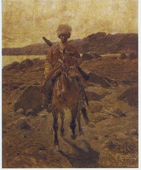 A Caucasian horseman near a lake