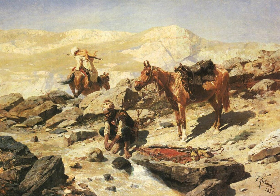 Отдыхающие черкесы со своими лошадьми на горном ручье