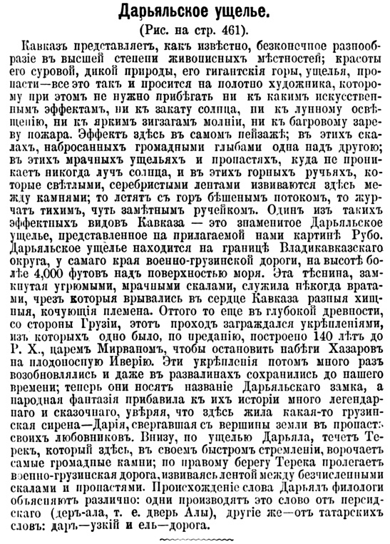 Кавказ представляет, как известно, бесконечное разнообразие в высшей степени живописных местностей; красоты его суровой, дикой природы, его гигантские горы, ущелья, пропасти – всё это так и просится на полотно художника, которому при этом не нужно прибегать ни к каким искусственным эффектам, ни к закату солнца, ни к лунному освещению, ни к ярким зигзагам молнии, ни к багровому зареву пожара. Эффект здесь в самом пейзаже; в этих скалах, набросанных громадными глыбами одна над другою; в этих мрачных ущельях и пропастях, куда не проникает никогда луч солнца, и в этих горных ручьях, которые светлыми, серебристыми лентами извиваются здесь между камнями; то летят с гор бешеным потоком, то журчат тихим, чуть заметным ручейком. Один из таких эффектных видов Кавказа – это знаменитое Дарьяльское ущелье, представленное при прилагаемой нами картине Рубо. Дарьяльское ущелье находится на границе Владикавказского округа, у самого края военно-грузинской дороги, на высоте более 4000 футов над поверхностью моря. Эта теснина, замкнутая угрюмыми, мрачными скалами, служила некогда вратами, чрез которые врывались в сердце Кавказа разные хищные, кочующие племена. Оттого-то ещё в глубокой древности, со стороны Грузии, этот проход заграждался укреплениями, из которых одно было, по преданию, построено 140 лет до Р.Х., царём Мирваном, чтобы остановить набеги хазаров на плодоносную Иверию. Эти укрепления потом много раз возобновлялись и даже в развалинах сохранились до нашего времени; теперь они носят название Дарьяльского замка, а народная фантазия прибавила к их истории много легендарного и сказочного, уверяя, что здесь жила какая-то грузинская сирена – Дария, свергавшая с вершины земли в пропасть своих любовников. Внизу, по ущелью Дарьяла, течёт Терек, который здесь, в своём быстром стремлении, ворочает самые громадные камни; по правому берегу Терека пролегает военно-грузинская дорога, извиваясь лентой между бесчисленными скалами и пропастями. Происхождение слова Дарьял филологи объясняют различно: одни производят это слово от персидского (дер-ала, т.е. дверь Алы), другие же – от татарских слов: дар – узкий и ель – дорога.