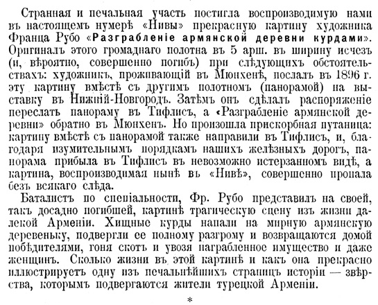 Странная и печальная участь постигла воспроизводимую нами в настоящем нумере «Нивы» прекрасную картину художника Франца Рубо «Разграбление армянской деревни курдами». Оригинал этого громадного полотна в 5 арш. в ширину исчез (и, вероятно, совершенно погиб) при следующих обстоятельствах: художник, проживающий в Мюнхене, послал в 1896 г. эту картину вместе с другим полотном (панорамой) на выставку в Нижний Новгород. Затем он сделал распоряжение переслать панораму в Тифлис, а «разграбление армянской деревни» обратно в Мюнхен. Но произошла прискорбная путаница: картину вместе с панорамой также направили в Тифлис, и, благодаря изумительным порядкам наших железных дорог, панорама прибыла в Тифлис в невозможно истерзанном виде, а картина, воспроизводимая ныне в «Ниве», совершенно пропала без всякого следа.