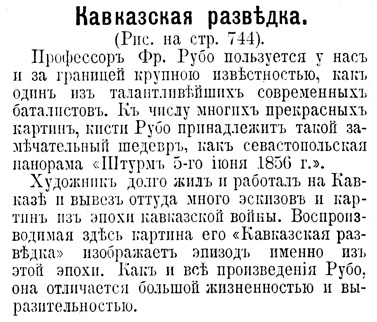 Художник долго жил и работал на Кавказе и вывез оттуда много эскизов и картин из эпохи кавказской войны. Воспроизводимая здесь картина его «Кавказская разведка» изображает эпизод именно из этой эпохи. Как и все произведения Рубо, она отличается большой жизненностью и выраизительностью.