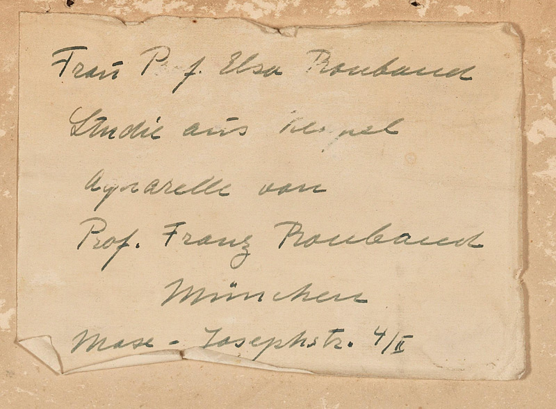 Этикетка с надписью "Frau Prof. Elsa Roubaud / Studie aus Neapel / Aquarell von / Prof. Franz Roubaud / München / Max-Josephstr. 4/II".