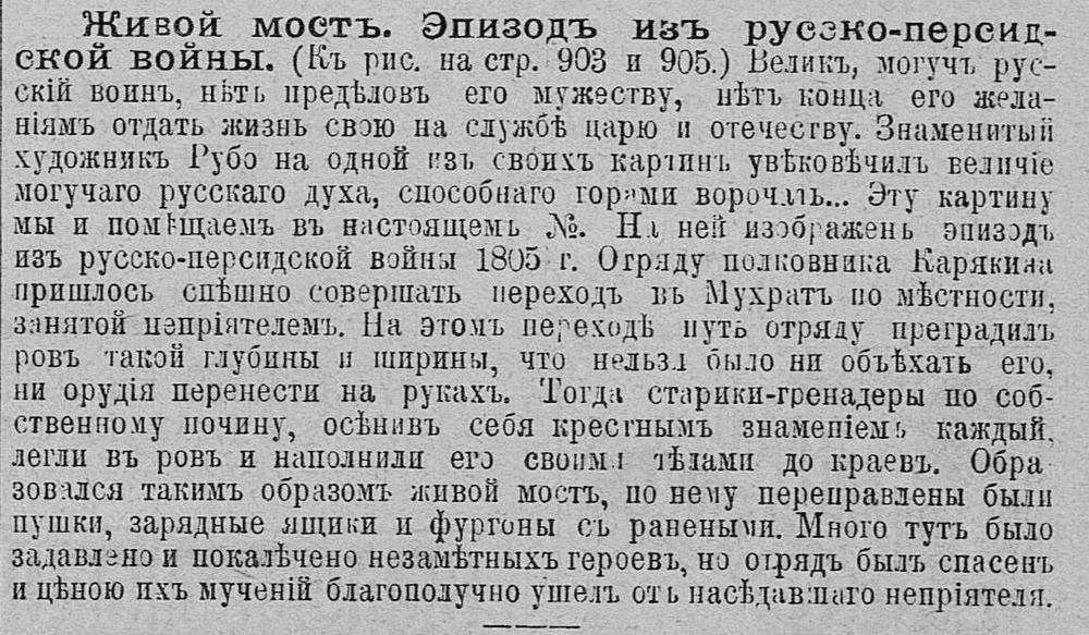 Велик, могуч русский воин, нет пределов его мужеству, нет конца его желаниям отдать жизнь свою на службе царю и отечеству. Знаменитый художник Рубо на одной из своих картин увековечил величие могучего русского духа, способного горами ворочить… Эту картину мы и помещаем в настоящем №. На ней изображён эпизод из русско-персидской войны 1805 г. Отряду полковника Карякина пришлось спешно совершать переход в Мухрат по местности, занятой неприятелем. На этом переходе путь отряду преградил ров такой глубины и ширины, что нельзя было ни объехать его, ни орудия перенести на руках. Тогда старики-гренадеры по собственному почину, осенив себя крестным знамением каждый легли в ров и наполнили его своими телами до краёв. Образовался таким образом живой мост, по нему переправлены были пушки, зарядные ящики и фургоны с ранеными. Много тут было задавлено и покалечено незаметных героев, но отряд был спасён и ценою их мучений благополучно ушёл от наседавшего неприятеля.