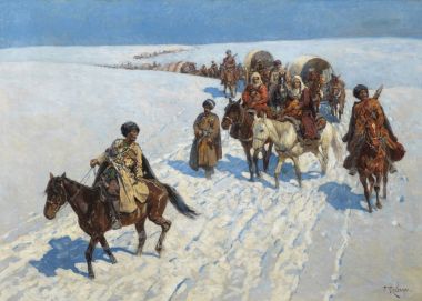 Вооружённые черкесы во главе каравана на заснеженном Кавказе